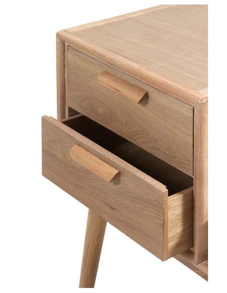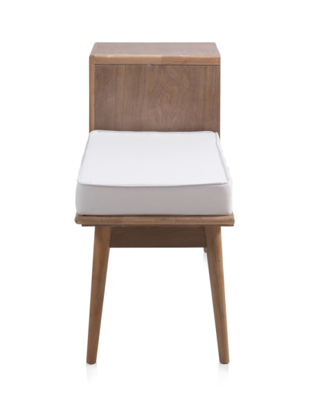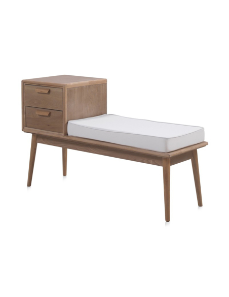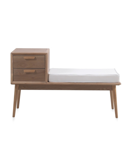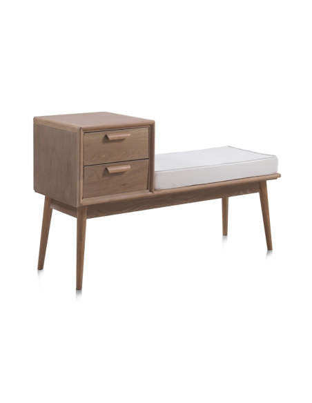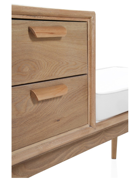 Banco Poniente con cojín y 2 cajones madera fresno, combina inteligentemente un cómodo asiento acolchado con un módulo de almacenamiento integrado de dos cajones, todo ello en madera maciza de fresno natural y sobre las características patas cónicas inclinadas. Este banco es increíblemente versátil: úsalo como descalzadora en la entrada, aprovechando los cajones para guardar llaves o accesorios y el asiento para calzarte cómodamente. También es ideal a los pies de la cama o como asiento auxiliar en cualquier rincón. El cojín blanco incluido garantiza el confort. Los cajones cuentan con los elegantes tiradores curvos de la colección. Una solución perfecta que aúna asiento y almacenaje con el estilo cálido y funcional del diseño escandinavo. Este banco Poniente es una pieza práctica, bonita y duradera para tu hogar.