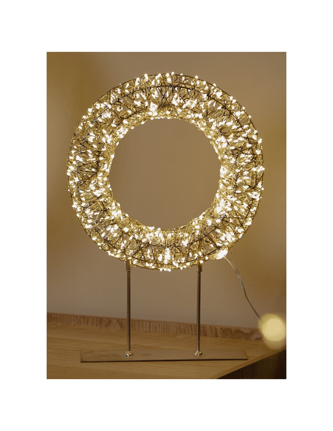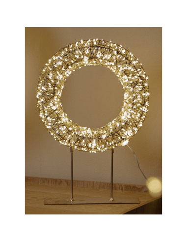 Corona oro pet c/pie 28d cm 800 leds, una corona luminosa con diseño circular y acabado dorado que aporta calidez y elegancia a cualquier espacio. Con 28 cm de diámetro y 800 luces LED cálidas, logra un efecto brillante y acogedor que resalta tanto en interiores como en áreas cubiertas. Su estructura de metal y PVC asegura ligereza y resistencia, mientras que el pie incluido permite exhibirla sobre mesas, aparadores o repisas sin necesidad de colgarla. Cuenta con 9 modos de funcionamiento para variar la intensidad y el tipo de luz según el momento, desde fija hasta intermitente. Su transformador de 31V 6W garantiza eficiencia energética y seguridad en el uso diario. El cable de 5 metros facilita la conexión en cualquier espacio. Una pieza compacta pero vistosa que combina funcionalidad y estilo en la decoración.