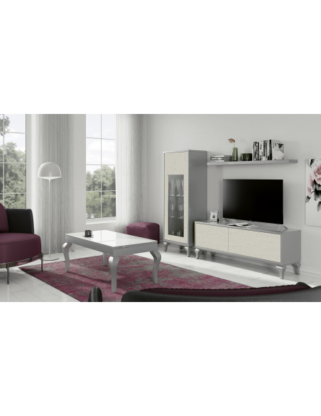 Composición de salón modelo NORA compuesto por: mesa de centro, mueble de TV, vitrina y estante.