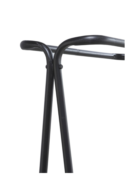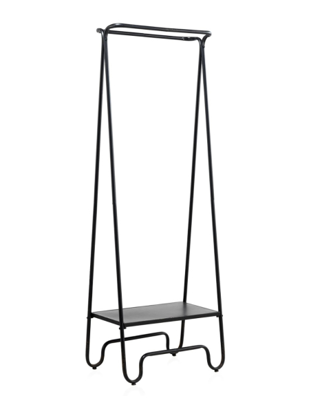 Perchero Levante estructura metal, fabricado en metal con un acabado negro (probablemente mate o ligeramente envejecido), presenta una estructura en forma de A con una barra superior para colgar perchas y un estante inferior para zapatos o cajas. Su diseño es ligero, funcional y ocupa poco espacio, siendo ideal para dormitorios, vestidores abiertos, recibidores o incluso como perchero auxiliar para invitados. Las patas con terminaciones curvadas le dan un toque de diseño sutil y estabilidad. Este perchero es la esencia de la funcionalidad industrial. Ofrece una solución práctica y estilosa para mantener tu ropa accesible y ordenada, encajando perfectamente en ambientes modernos, minimalistas, industriales o nórdicos.