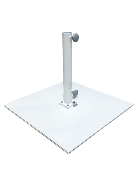 Base de parasol plancha metálica 20 kg. De hierro lacado en blanco, con 4 agujeros de anclaje, 1 pomo de ajuste y 20 kg de peso. Medidas 60 x 60 cm con tubo de 45 cm de altura.