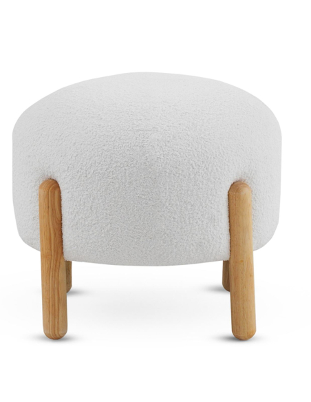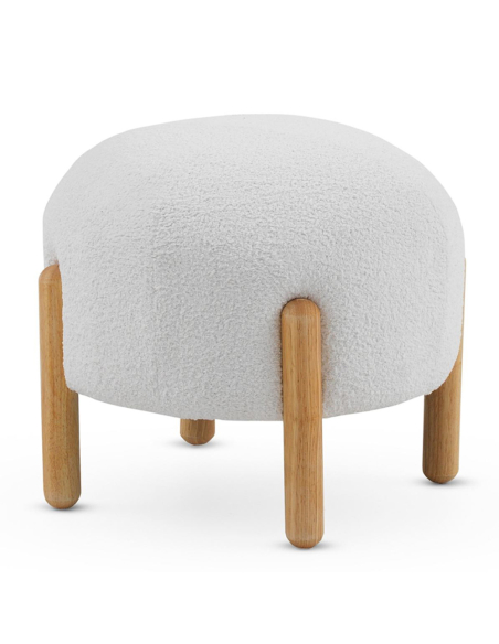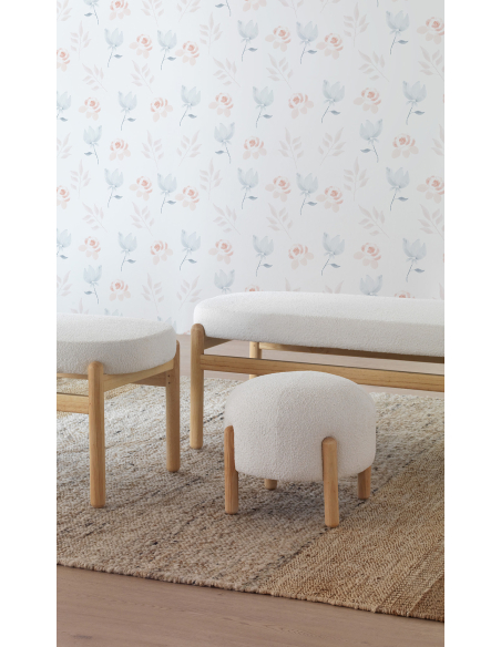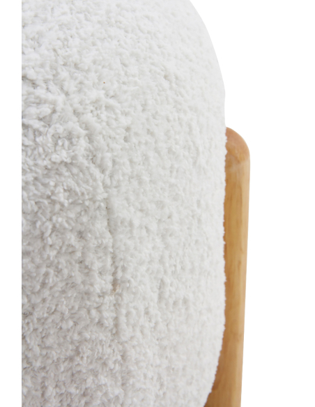 Puf Ola tapizado bouclé blanco, este encantador puf combina un asiento redondo generosamente tapizado en suave tejido bouclé de color blanco con cuatro patas cilíndricas de madera maciza de pino en acabado natural. El contraste entre la textura acogedora del bouclé y la calidez natural de la madera crea una pieza visualmente atractiva y muy versátil. El puf Ola es perfecto como asiento auxiliar, reposapiés o incluso como un elemento decorativo por sí solo. Su tamaño compacto lo hace ideal para cualquier rincón del salón, dormitorio o habitación infantil. El tapizado bouclé blanco aporta luminosidad y una sensación de confort, mientras que las patas de pino le dan un aire escandinavo y natural. Este puf combina diseño y funcionalidad de forma sencilla. Su estética limpia y la combinación de materiales lo hacen fácil de integrar en múltiples estilos decorativos. Aporta un asiento extra lleno de encanto y calidez a tu hogar.