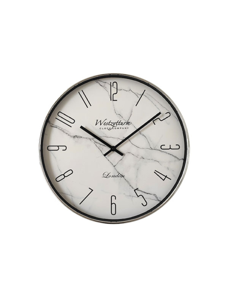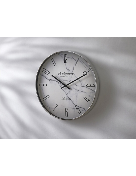 Reloj de pared "Westzytturm" plata y mármol. Con un fondo que imita el mármol blanco y detalles en negro, este reloj de pared es muy original. De diseño moderno, cuenta con números minimalistas y un borde plateado.
