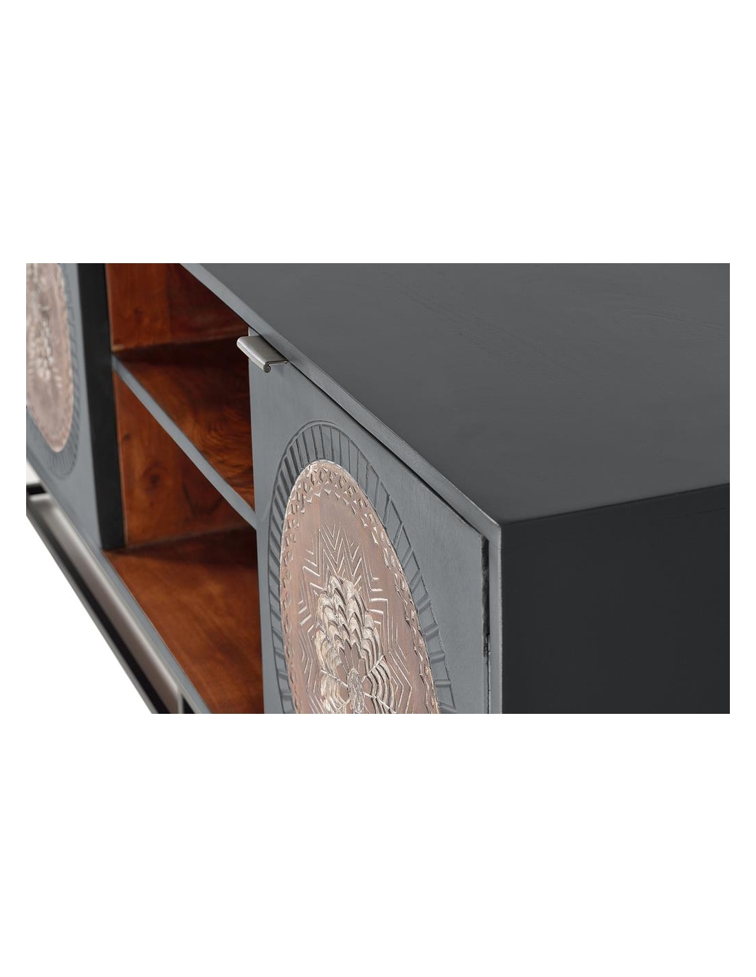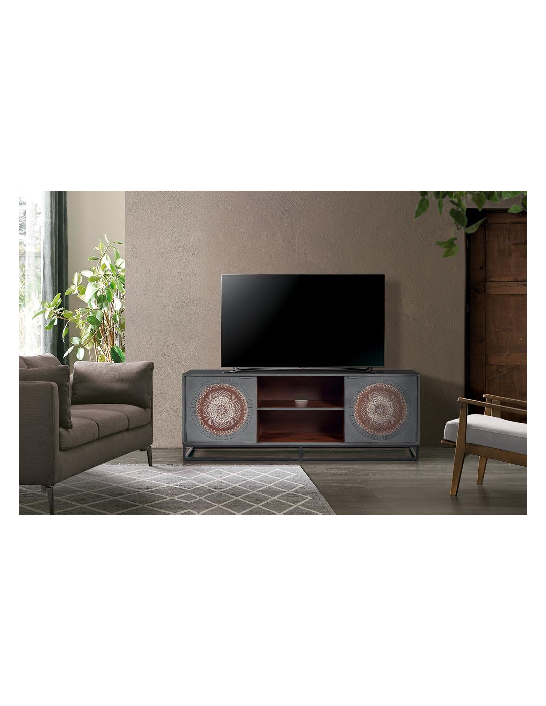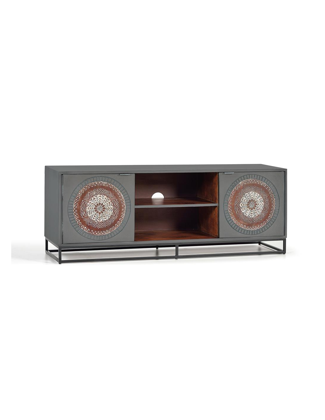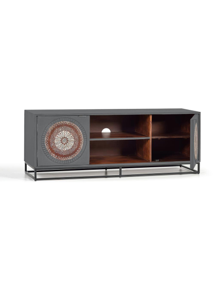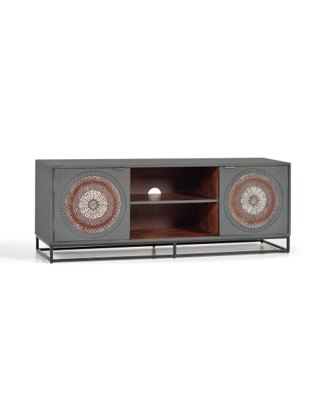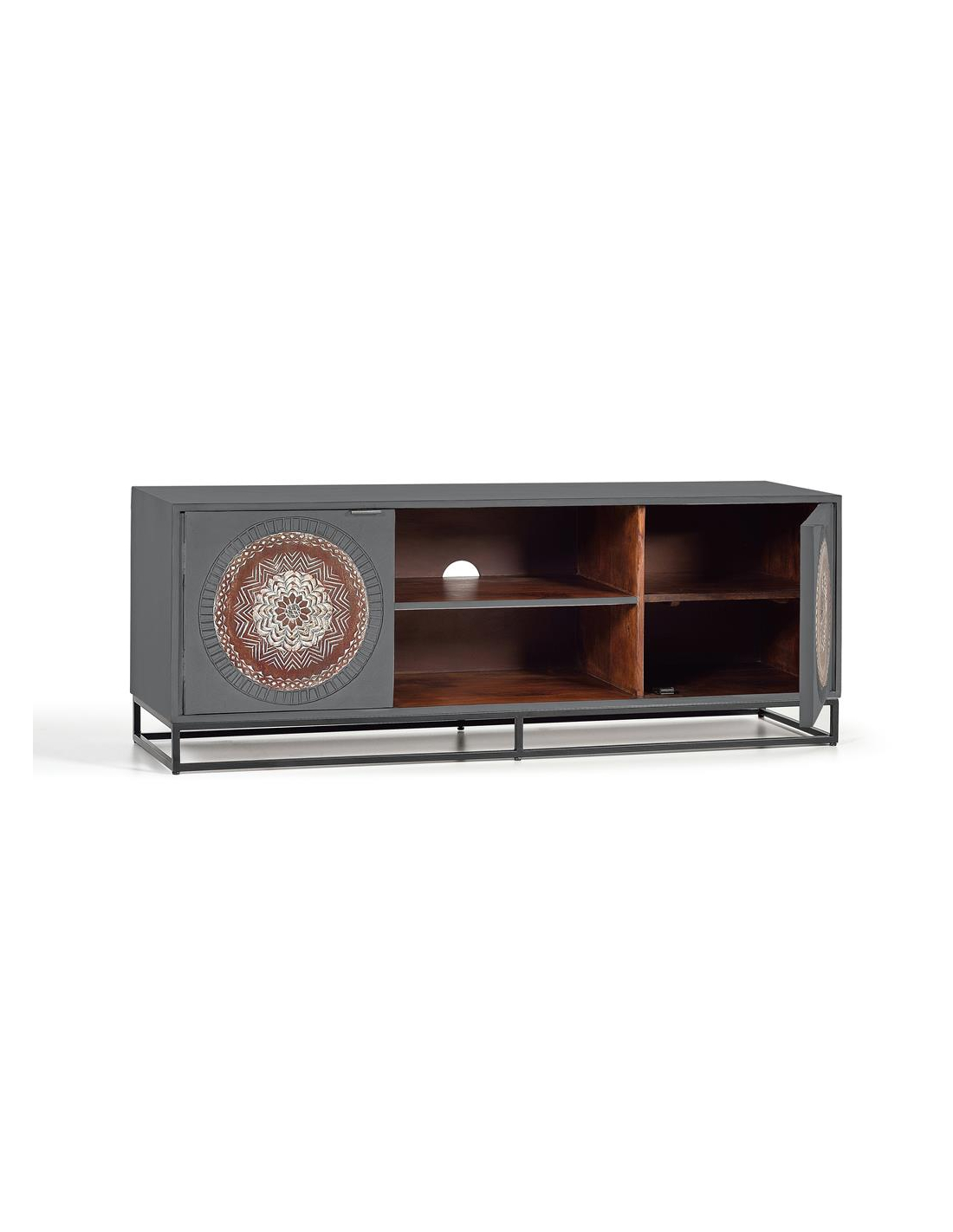 Disfruta de un salón renovado con este mueble tv 2 puertas en madera de mango y base de metal. Con sus detalles hechos a mano, será una pieza atractiva y que combinará con todos los estilos de mobiliario y decoración. Además, la madera de mango es un gran aliado a la hora de decorar tu hogar por su calidad y características únicas (como las propiedades, la longevidad y los tonos que se consiguen con ella).