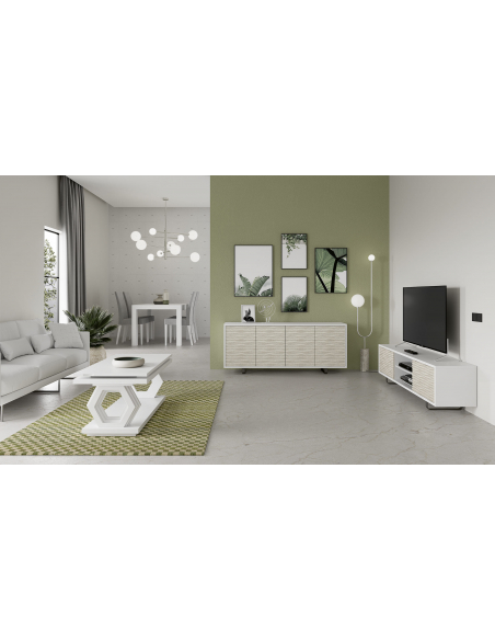 Composición de salón modelo NORA compuesto por: Mesa de centro, mueble de TV, aparador y mesa de comedor con cuatro sillas.