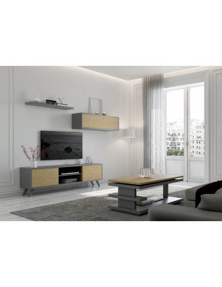 - Acabados: mesa de centro con base en Plomo y tapa en madera roble anudado color Nórdico. Mueble de TV base en Plomo y frente Nórdico Opción 7 con pata 1. Módulo oclgante base en Plomo y frente Opción 7 en Nórdico. Estante en Plomo.