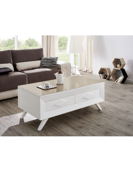 - Acabados 2 (mesa centro): Blanco con pata 1 y tirador E. Tapa en cristal color Arena.