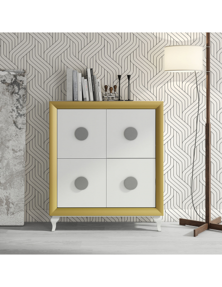 - Acabados 5 (aparador): Base, frentes y pata nº2 en Blanco, molduras en Oro-10 y tirador F en Plata-10.