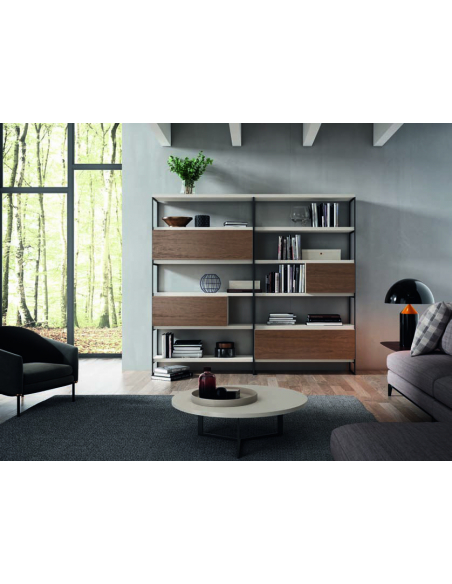 Estantería compuesta por tres costados metálicos, seis tableros horizontales, y cuatro módulos con puertas. El módulo superior tiene la puerta elevable y los otros tres abatibles, para la comodidad del día a día. Es personalizable y las piezas y módulos se envían sueltos, por lo que la configuración es totalmente adaptada a tus gustos y necesidades.