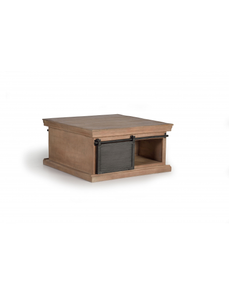 Mesa de centro puerta corredera. Mesa de centro madera en madera de mango de estilo industrial con puerta corredera de metal en color gris oscuro y dos cajones.