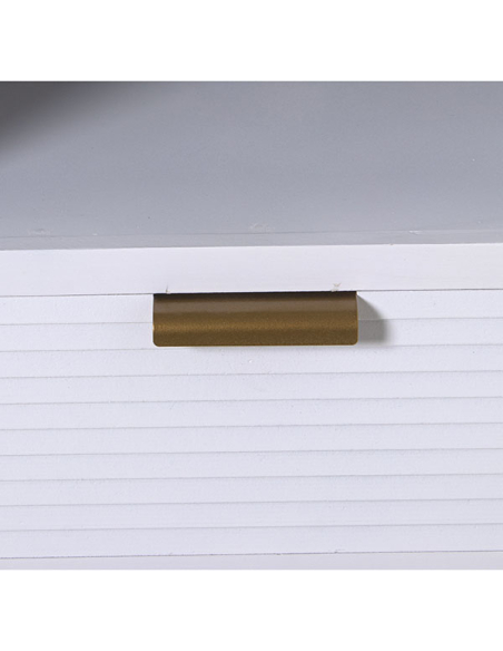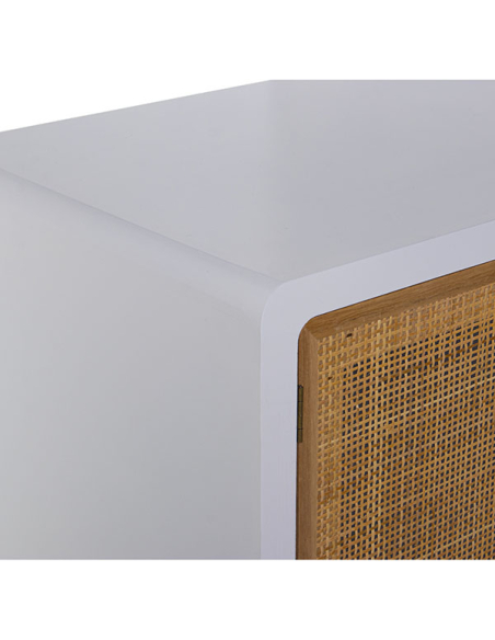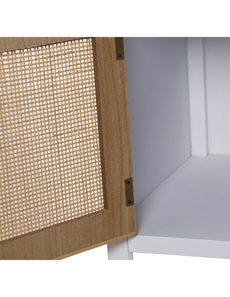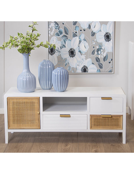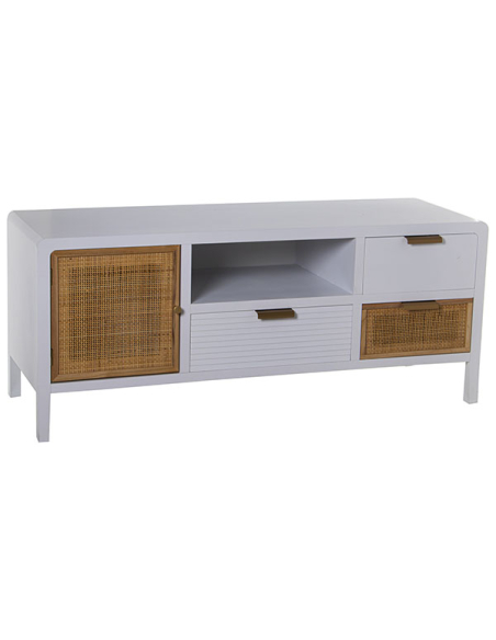 Mueble tv madera dos cajones y puerta blanco y ratán
