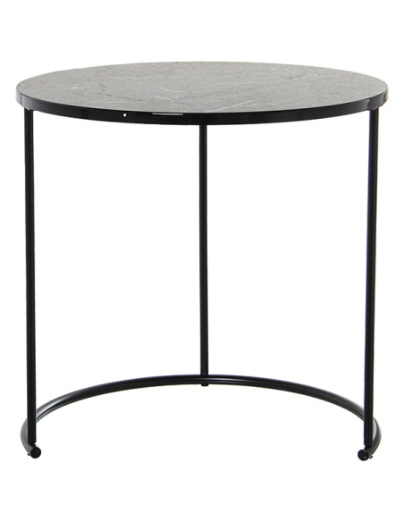 Set 2 mesas auxiliares metal y madera acabado mármol negro. Este set de dos mesas auxiliares cuenta con un diseño moderno y elegante, con una tapa de mármol negro y estructura de metal que le aporta funcionalidad y estilo a cualquier espacio. Sus medidas son de ø 42X44 CM y ø 50X49 CM.