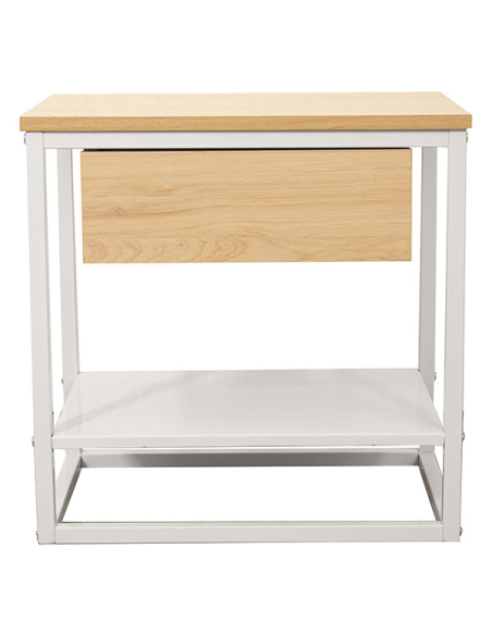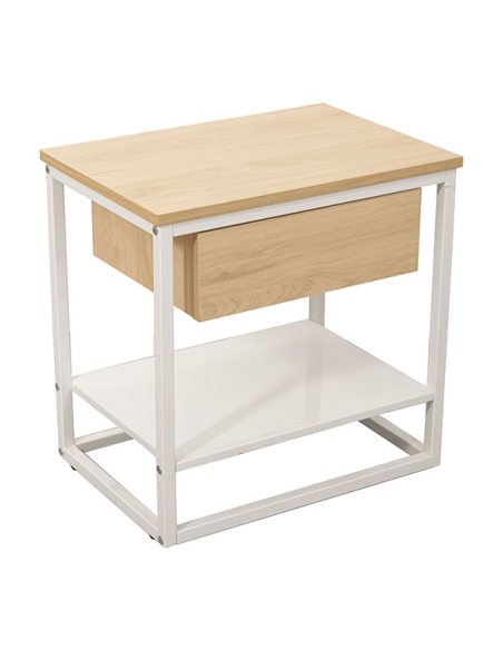 Mesa auxiliar metal blanco con cajón madera natural
