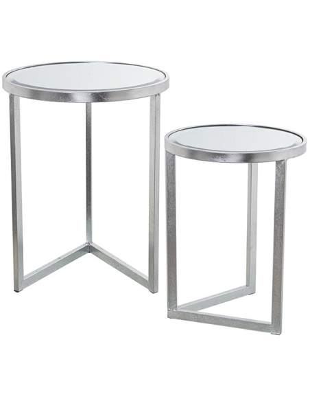 Set 2 mesas auxiliares metal plateado con cristal espejo. Este set de dos mesas auxiliares en metal plateado con cristal espejo es una adición perfecta a cualquier espacio. Sus acabados brillantes y modernos aportan elegancia a cualquier habitación.