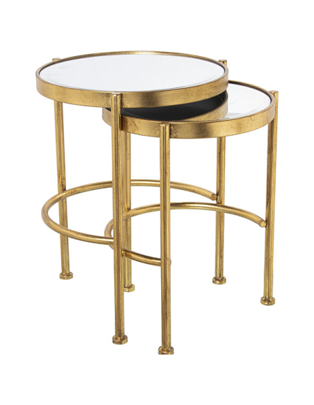 Set 2 mesas auxiliares metal dorado con cristal espejo. estas dos mesas auxiliares en metal dorado con cristal espejo son perfectas para añadir un toque de elegancia a cualquier espacio. Son prácticas y modernas, ideales para cualquier ocasión.