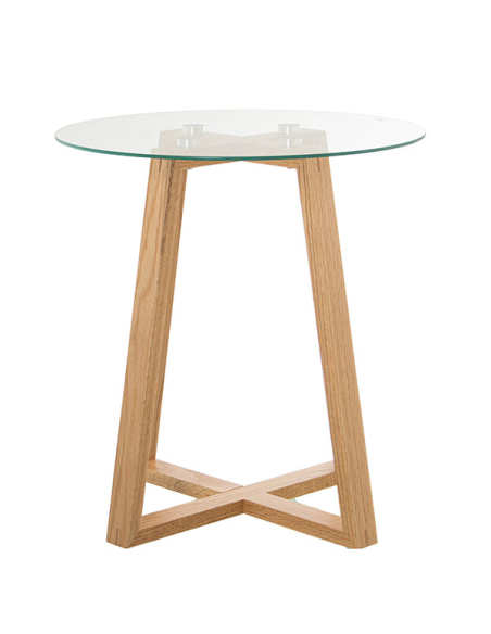 Mesa auxiliar cristal patas madera natural. esta mesa auxiliar de cristal templado y patas de madera natural es elegante y sofisticada. Con un diámetro de 48x51cm y hecha de roble, es una pieza imprescindible en cualquier hogar.