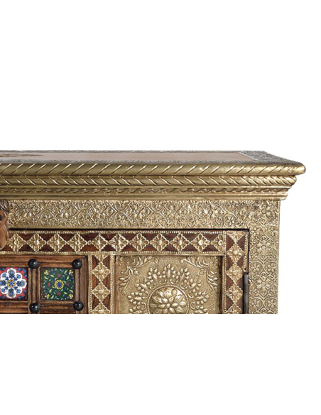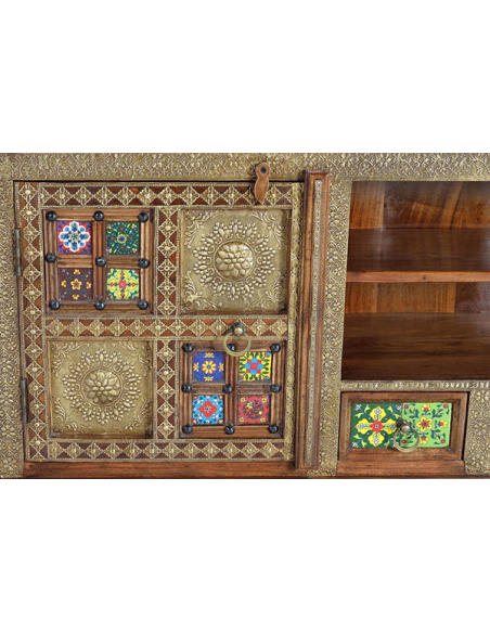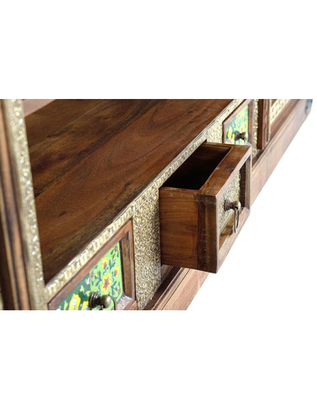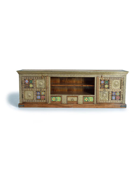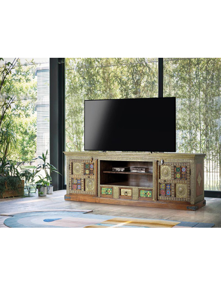Mueble TV Nagoya en madera de acacia maciza con  aplicaciones en azulejo y bronce repujado con 2 puertas, 3 cajones y estante central.