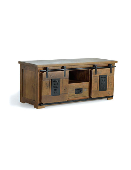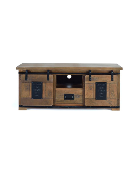 Mueble TV Acra en madera de mango en estilo industrial con 2 puertas correderas y 1 cajón.