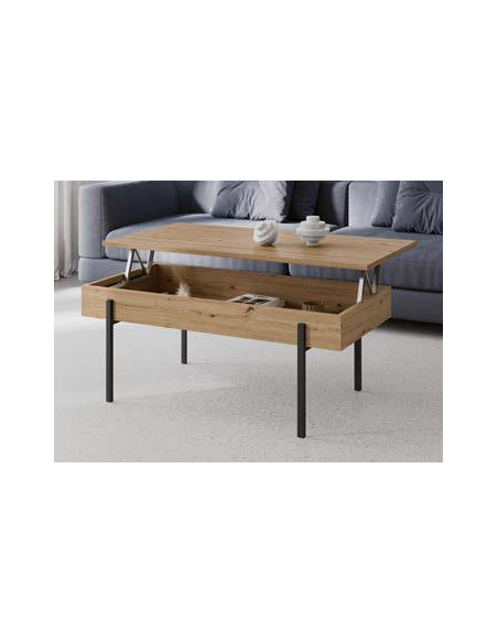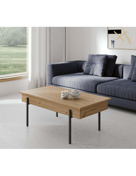Mesa de centro elevable modelo Natura con patas metálicas. Fabricada con tableros melamínicos de primera calidad, resistentes al impacto, fácil de limpiar y con propiedades antibacterianas y antivíricas.