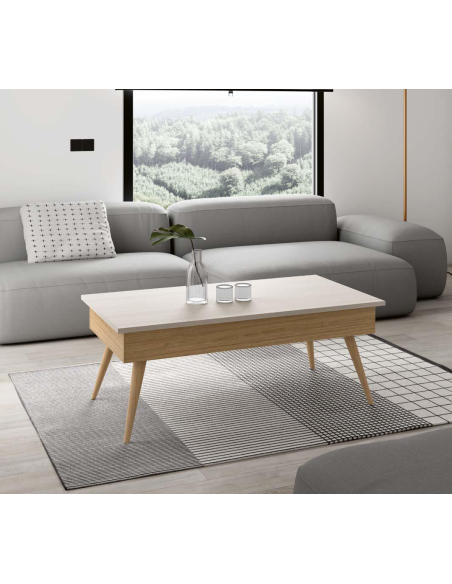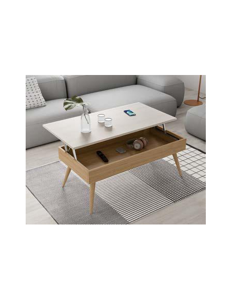 Mesa de centro elevable modelo Natura 116 con patas de madera. Fabricada con tableros melamínicos de primera calidad, resistentes al impacto, fácil de limpiar y con propiedades antibacterianas y antivíricas.