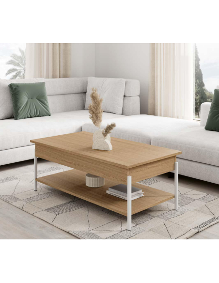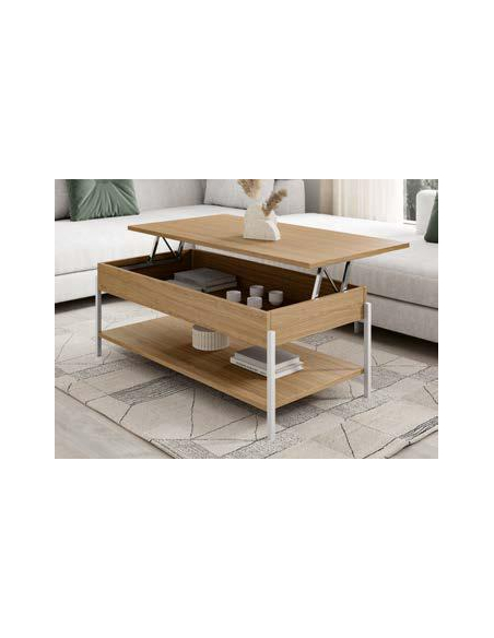 Mesa de centro elevable modelo Natura 103 con patas de metal y estante en la parte inferior para poder colocar las cosas que necesitamos tener a mano. Fabricada con tableros melamínicos de primera calidad, resistentes al impacto, fácil de limpiar y con propiedades antibacterianas y antivíricas.
