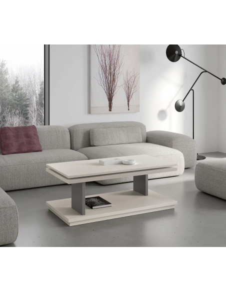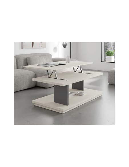 Mesa de centro elevable modelo Natura 109 con base y patas centrales en el mismo material. Fabricada con tableros melamínicos de primera calidad, resistentes al impacto, fácil de limpiar y con propiedades antibacterianas y antivíricas.
