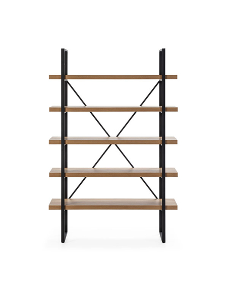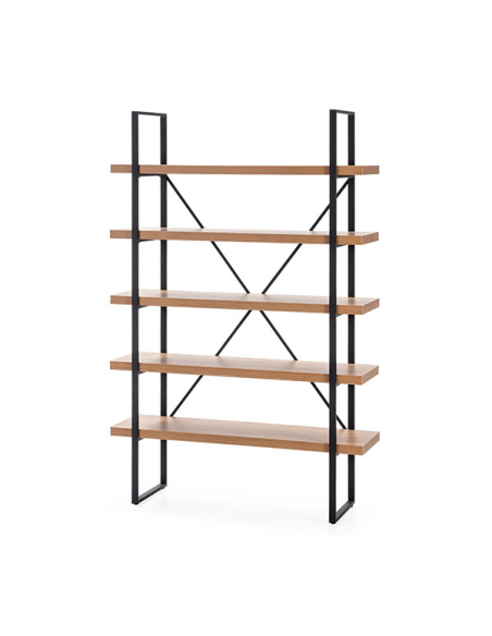 Estantería SH-251 City laminado color roble 120cm, fabricada con los costados en metal acabado negro y 5 baldas laminadas en color roble. Por la parte de atrás refuerzo en cruz en metal negro para darle fuerza y sujeción a la estantería. Por su tamaño de ancho, 120 cm, nos facilita tener visibles nuestros objetos decorativos o a mano los artículos cotidianos.