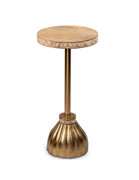 Mesa auxiliar madera y metal dorado para añadir un toque de glamour a cualquier espacio. La combinación de los materiales le da una apariencia sofisticada y atractiva. La parte superior de la mesa esta fabricada con madera con el canto tallado lo que le da un aspecto cálido y natural. La estructura esta fabricada en metal dorado que le da un toque elegante, con detalle en la base. Una mesa auxiliar que se puede utilizar en diferentes áreas de la casa, como la sala de estar, el dormitorio o el estudio. Puede ser utilizada como soporte para una lámpara, como superficie de apoyo para una taza de café o como una pieza decorativa para exhibir objetos.