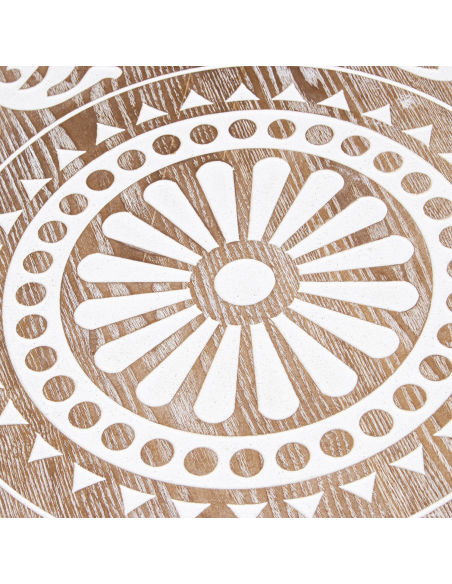 Mesa de centro Kanpur II en madera tallada natural y blanco patas metal dorado. La colección de mesa Kanpur II se destaca por las encimeras con un mosaico floral en acabado blanco con el fondo en acabado madera natural y las patas de metal dorado, lo que las convierte en unas piezas elegantes y sofisticadas que serán el centro de atención en el espacio que se coloquen.