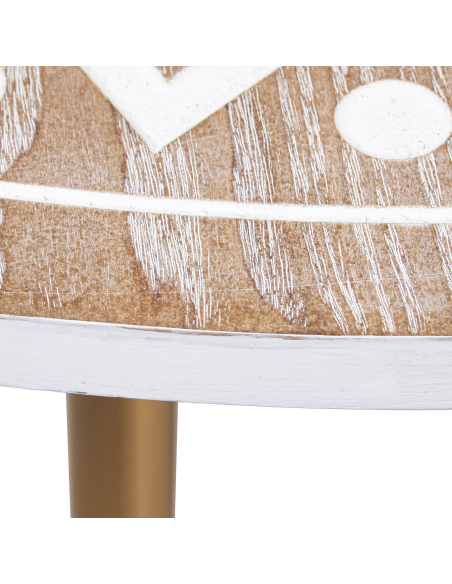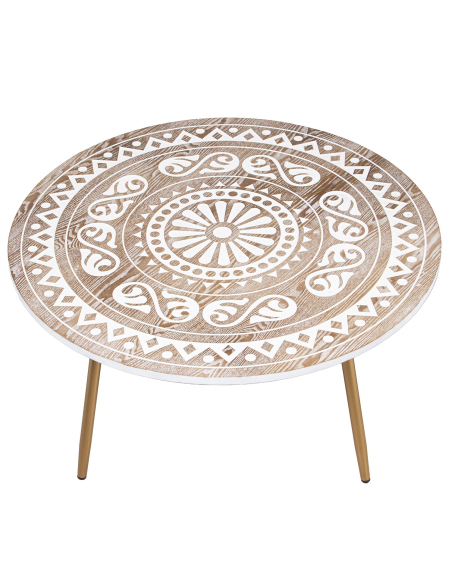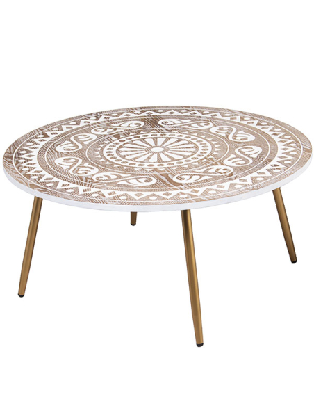 Mesa de centro Kanpur II en madera tallada natural y blanco patas metal dorado