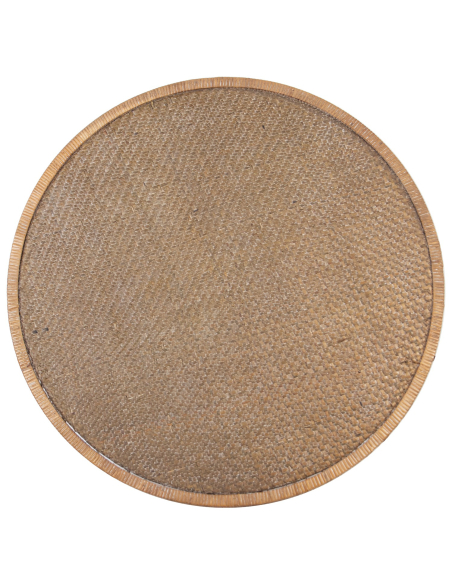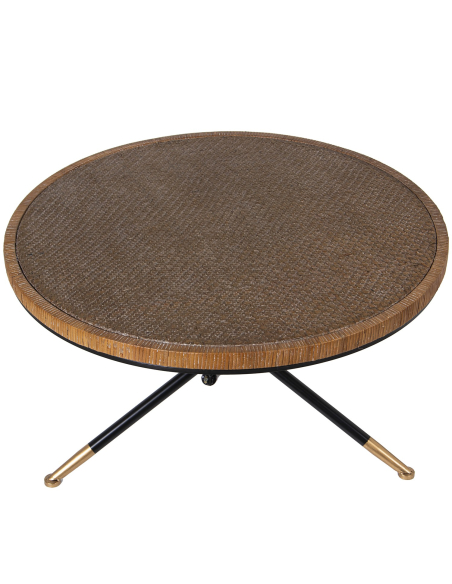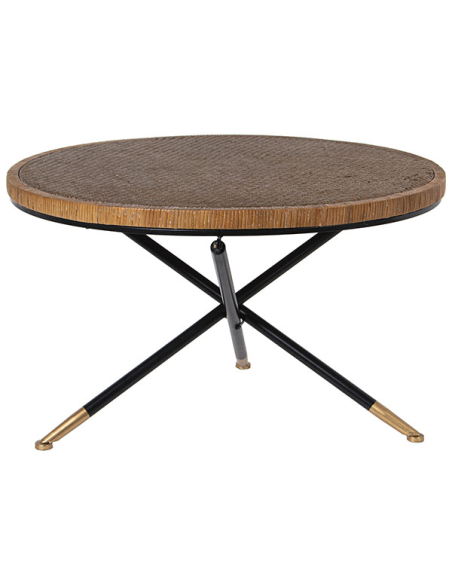 Mesa de centro redonda madera con borde trenzado y patas de metal