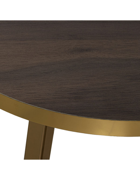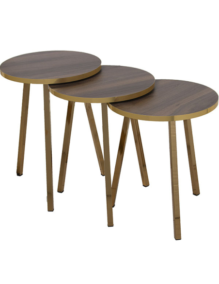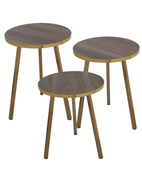 Set 3 mesas auxiliares madera color nogal con patas metal acabado dorado