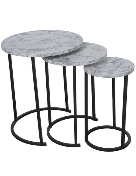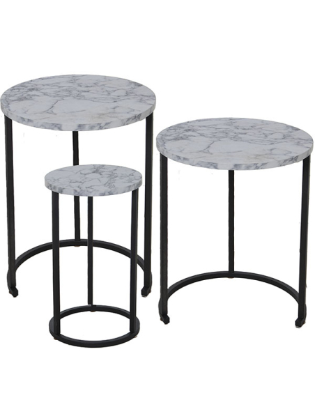Set 3 mesas auxiliares de madera efecto mármol blanco y patas metal negras
