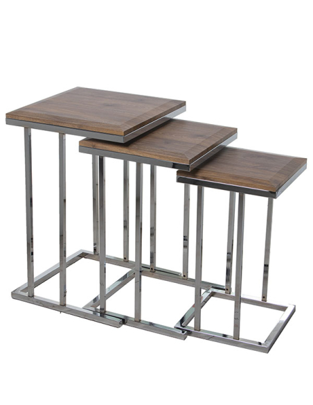 Set 3 mesas auxiliares de madera tablero biselado con patas metal cromado