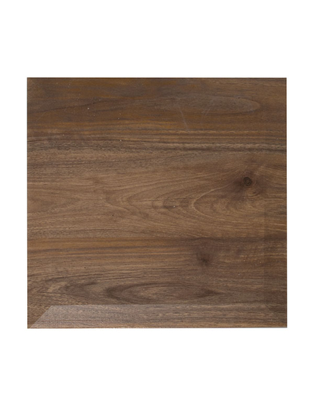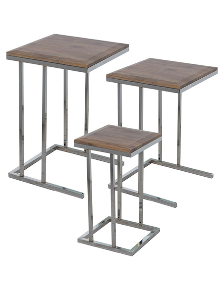 Set 3 mesas auxiliares de madera tablero biselado con patas metal cromado. Tres mesas en diferentes tamaños con la encimera en forma cuadrada en acabado madera y estructura metálica en acabado cromado.