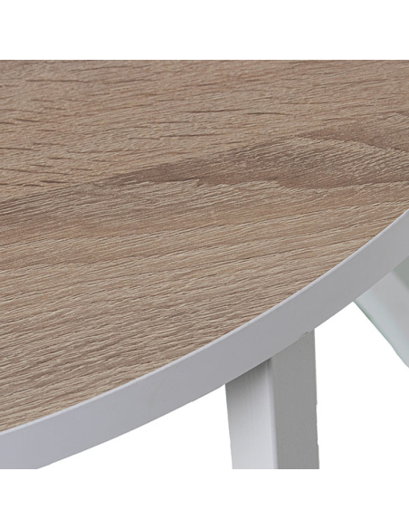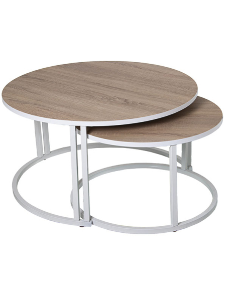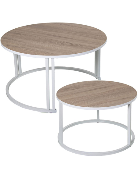 Set 2 mesas de centro de madera acabado roble y patas metal blancas. Con las encimeras en acabado roble que resalta la belleza natural de la madera y las estructuras de metal blanco que les proporciona un toque moderno y elegante. Tiene un diseño redondo perfecto para colocarlas en el centro del salón.