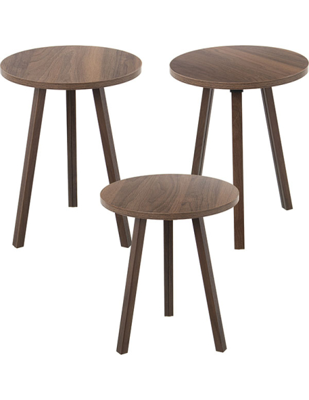 Sencillo Set 3 mesas auxiliares madera color nogal con el decorar cualquier espacio de la casa. Tres mesitas que proporcionarán un ambiente cálido por su acabado en madera color nogal.