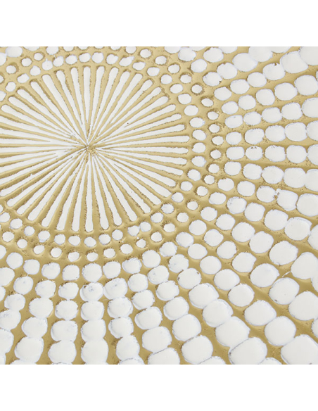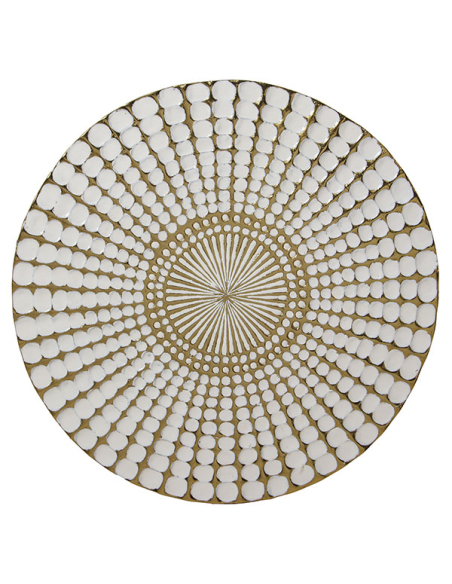Mesa auxiliar metal esmaltado blanco y dorado, patas negras, tapa redonda con delicados detalles circulares a contra tono en toda la superficie. El acabado blanco impecable se combina con detalles en dorado y patas angostas negras, creando una pieza que aporta estilo y versatilidad a tu hogar. Esta mesa es perfecta para añadir un toque chic a tu sala de estar, dormitorio o cualquier rincón que desees destacar. Su diseño único y contemporáneo la convierte en una adición esencial para aquellos que buscan funcionalidad sin comprometer el estilo.