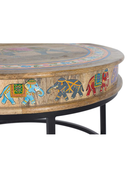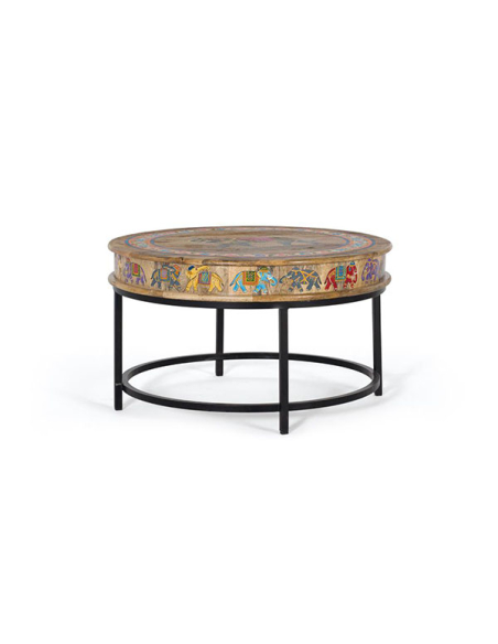 Mesa de centro Elefante detalles pintados a mano, una verdadera obra de arte para apreciar todos los días. Con una tapa redonda de madera inundada de hermosos detalles y una base de metal negro liso, combina funcionalidad y estilo a la perfección. Los elefantes pintados a mano en el contorno de la tapa y en el centro añaden un toque de exotismo y encanto. Perfecta como punto focal en tu sala de estar, esta mesa será el centro de atención en cualquier ambiente.