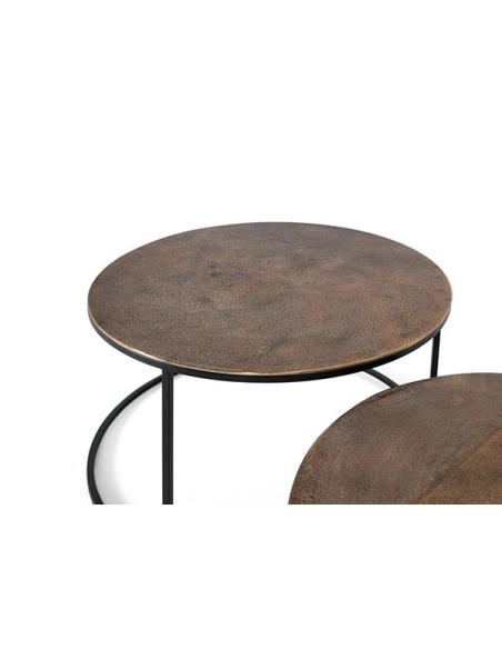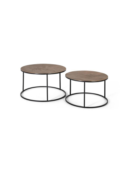 Set de 2 mesas redondas cobre, una opción elegante y moderna para cualquier espacio. Las tapas redondas de cobre agregan un toque de calidez y sofisticación, mientras que la estructura metálica en color negro proporciona un contraste audaz y contemporáneo. Cada mesa tiene tres soportes y un círculo en la base para una mayor estabilidad y estilo. Estas mesas son perfectas para añadir un toque de glamour industrial a tu sala de estar o área de entretenimiento. Este set de mesas puede ser utilizado de manera individual o en conjunto, son fácilmente trasladables de ser necesario.