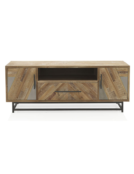 Mueble TV Cancún madera abeto con base en tubo metálico, una fusión perfecta entre estilo y funcionalidad. Este elegante mueble presenta una base robusta de tubo metálico que garantiza estabilidad y durabilidad. El frente del mueble está adornado con una cautivadora decoración en color gris plateado y madera rustica, resaltada por listas metálicas doradas incrustadas que añaden un toque de sofisticación y glamour a tu sala de estar. Los tiradores verticales metálicos en color gris oscuro complementan perfectamente el diseño, proporcionando un contraste sutil pero impactante. Con un estante interior fijo, un cajón y dos puertas laterales, este mueble TV ofrece un espacio conveniente para organizar tus dispositivos multimedia, consolas de juego y otros accesorios. Además de su estética impresionante, la funcionalidad es una prioridad, permitiéndote mantener tu área de entretenimiento ordenada y bien organizada.