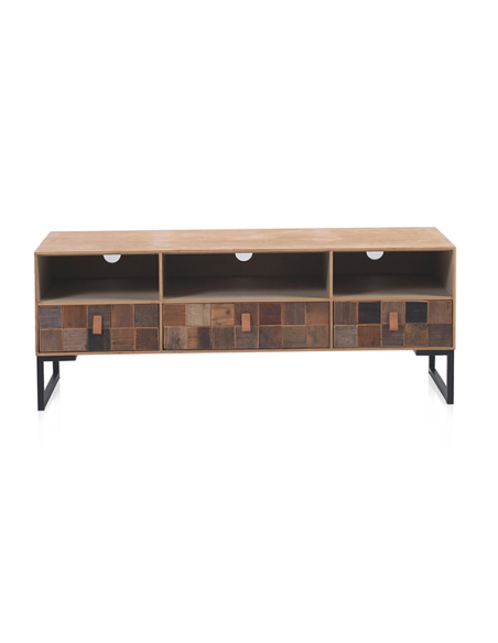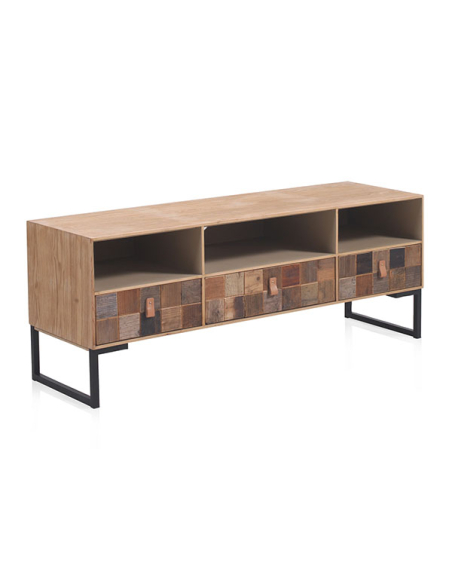 Mueble Jano TV chapado fresno madera reciclada, con su frontal adornado con lamas de madera reciclada en una variedad de colores, este mueble es una verdadera declaración de estilo y originalidad. Con un triple compartimento para dispositivos electrónicos, el mueble Jano TV proporciona un espacio funcional y ordenado para tu equipo multimedia. Además, cuenta con tres cajones con guías de madera, ofreciendo un amplio almacenamiento para tus accesorios y objetos personales. Los tiradores de cuero añaden un toque de lujo y sofisticación al diseño, mientras que la base metálica en color negro proporciona estabilidad y un contraste visual moderno.