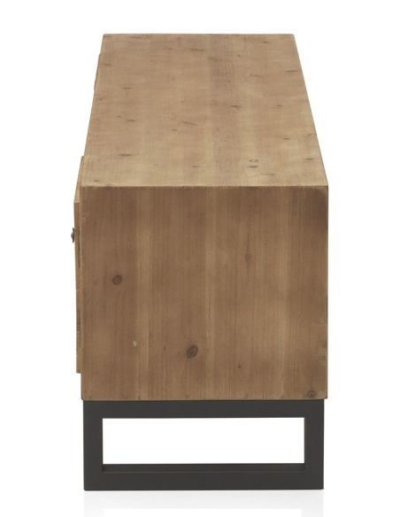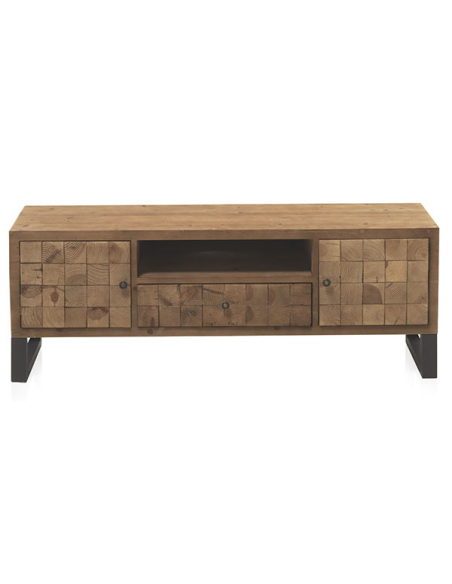 Mueble TV Saturno de madera de bloques, equipado con dos puertas y un cajón con guías de madera, el mueble de TV Saturno ofrece un amplio espacio de almacenamiento para tus dispositivos multimedia y accesorios. El frontal de los cajones y puertas está decorado con cubos de madera reciclada, agregando un toque de textura y estilo único al diseño. Las patas metálicas en color negro proporcionan estabilidad y resistencia, mientras que los tiradores metálicos en oro envejecido añaden un toque de lujo y sofisticación al mueble. Además, cuenta con un compartimento especial para dispositivos electrónicos, manteniendo los cables organizados y fuera de la vista.