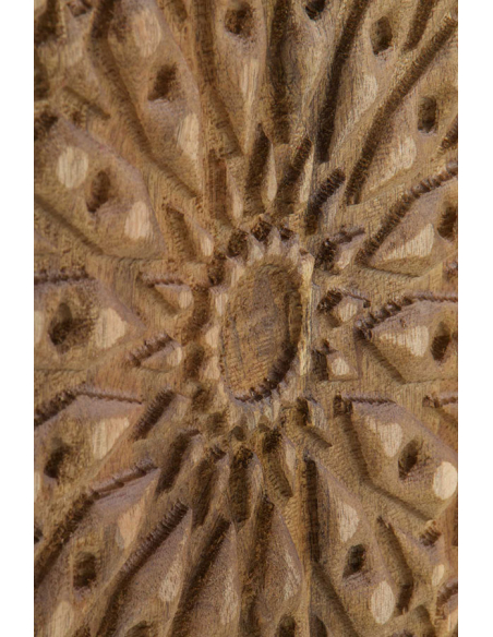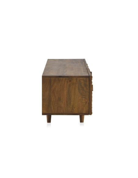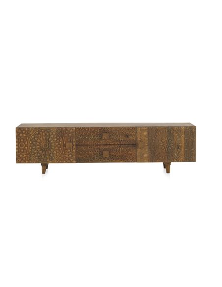 Mueble TV calado madera natural mango 2 puertas y 2 cajones, este mueble ofrece un amplio espacio de almacenamiento para tus dispositivos multimedia y accesorios. Las patas de madera de 10 cm de altura proporcionan una base sólida y estable, elevando el mueble y añadiendo un toque de elegancia al diseño. Los cajones equipados con guías de madera garantizan un funcionamiento suave y sin esfuerzo, facilitando el acceso a tus pertenencias. El frente labrado con formas geométricas orientales añade un elemento de estilo y sofisticación al diseño, creando un punto focal visualmente cautivador en tu espacio. Los tiradores de madera complementan perfectamente el aspecto natural del mueble, mientras que las bisagras de cierre suave aseguran un manejo silencioso y seguro de las puertas.