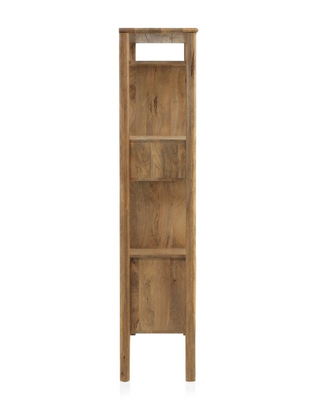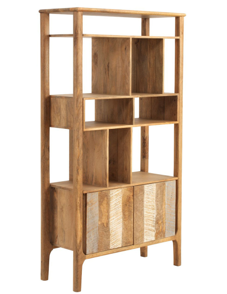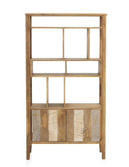 Librería Cupido listones madera maciza de mango gris envejecido, es una expresión de encanto rústico y elegancia contemporánea. Con dos puertas inferiores equipadas con el práctico sistema de apertura "push-push", esta librería ofrece un acceso fácil y conveniente a su amplio espacio de almacenamiento sin la necesidad de tiradores externos, manteniendo un aspecto limpio y minimalista. Además, las bisagras de cierre suave garantizan un cierre silencioso y seguro de las puertas, añadiendo un toque de comodidad y refinamiento al diseño. En la parte superior, encontrarás una variedad de divisiones con estantes que proporcionan espacio para exhibir y organizar tus libros, decoraciones y objetos personales de manera ordenada y decorativa.