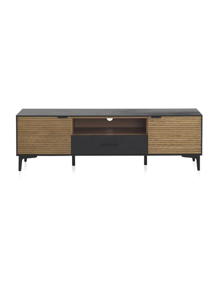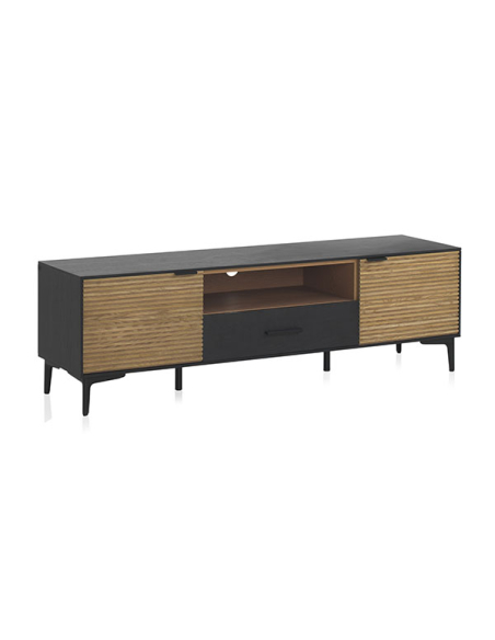 Mueble TV Frey chapada fresno color negro puertas en natural, su diseño está marcado por la madera de fresno chapada en un rico color negro, acentuado por puertas naturales de madera de mango con intrincadas decoraciones de listas y tiradores metálicos que añaden un toque de sofisticación. Las puertas, equipadas con bisagras de cierre suave, brindan un acceso sin esfuerzo a su interior, donde encontrarás un cajón central con guías metálicas suaves para un deslizamiento fluido y silencioso. Este mueble no solo es estéticamente impresionante, sino también altamente funcional: cuenta con un estante central abierto diseñado para acomodar dispositivos electrónicos y accesorios multimedia. La versatilidad de este mueble permite una fácil integración en cualquier espacio de entretenimiento o sala de estar. Además, su montaje es rápido y sencillo, con las patas incluidas y los tornillos necesarios, lo que garantiza una instalación sin complicaciones.