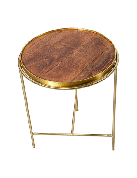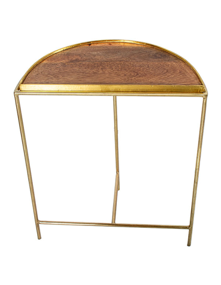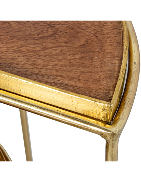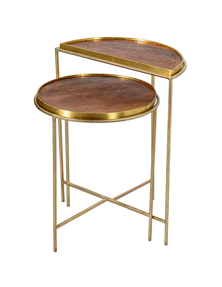 Set de mesas auxiliares redonda y semi circulo, la estructura y el contorno de color plateado aportan un toque moderno y sofisticado, mientras que las tapas de madera a dos alturas ofrecen versatilidad y funcionalidad. El refuerzo en cruz en la parte inferior no solo asegura la estabilidad, sino que también añade un detalle estético único. Perfectas para complementar la decoración de tu salón, dormitorio o cualquier rincón de tu hogar, estas mesas son la combinación ideal de estilo y practicidad.
