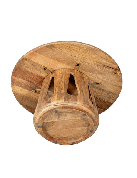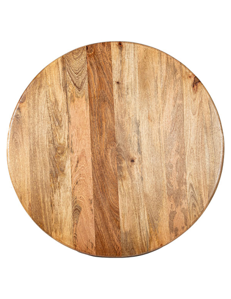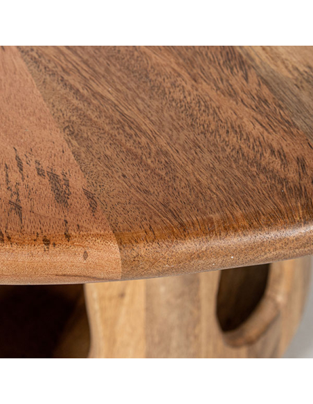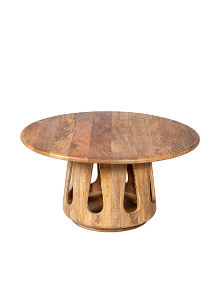 Mesa de centro Mustang calada 90 cm, es una pieza verdaderamente única que destaca por su diseño original. La tapa y la base de madera están cuidadosamente trabajadas, con un calado en forma de gotas alrededor de todo el contorno, permitiendo una visión clara a través de la estructura. Este detalle no solo añade un toque de elegancia, sino que también crea una sensación de ligereza y espacio. Ideal para salas de estar que buscan un mueble funcional y estéticamente agradable, esta mesa es una combinación perfecta de diseño y practicidad.