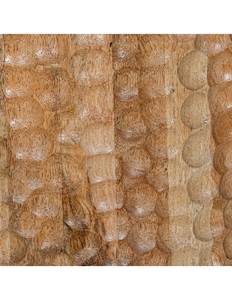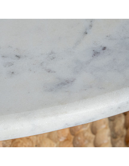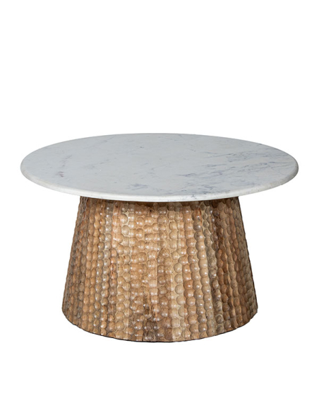 Mesa de centro tapa mármol Falabella 84 cm, aporta un toque de lujo y sofisticación a cualquier espacio. La base de madera de mango, decorada con calados redondos en toda su superficie, añade un elemento de diseño artesanal que contrasta maravillosamente con la elegancia del mármol. Esta mesa es perfecta para aquellos que buscan una pieza distintiva y elegante para su sala de estar, combinando materiales de alta calidad con un diseño innovador y atractivo.