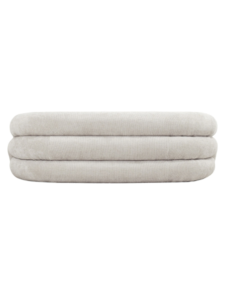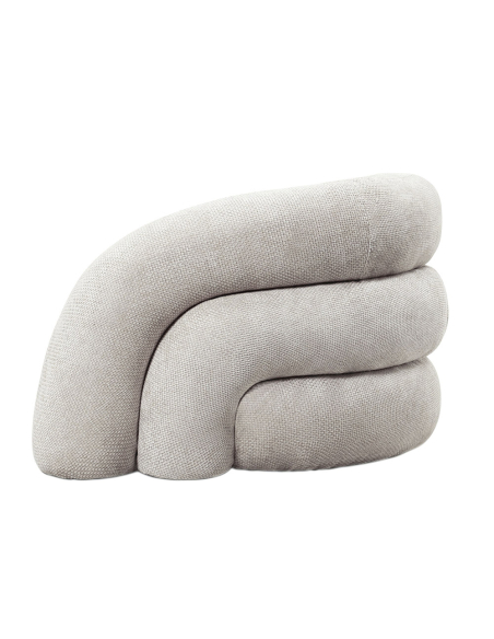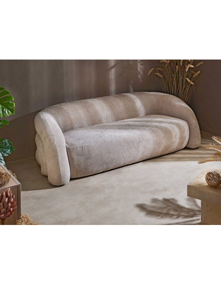 Sofá 3 plazas Khalid chenilla gruesa beige, el respaldo se extiende de manera continua hacia los apoyabrazos, creando una línea fluida y elegante. Los laterales, con una terminación redondeada, aportan un toque suave y acogedor, mientras que la parte trasera, realizada en tres secciones curvas en formato arcoíris, añade un elemento visual dinámico y moderno. Perfecto para salones o áreas de descanso, este sillón no solo invita a relajarse, sino que también se convierte en un punto focal de decoración, ideal para quienes buscan un diseño único y contemporáneo en su hogar.
